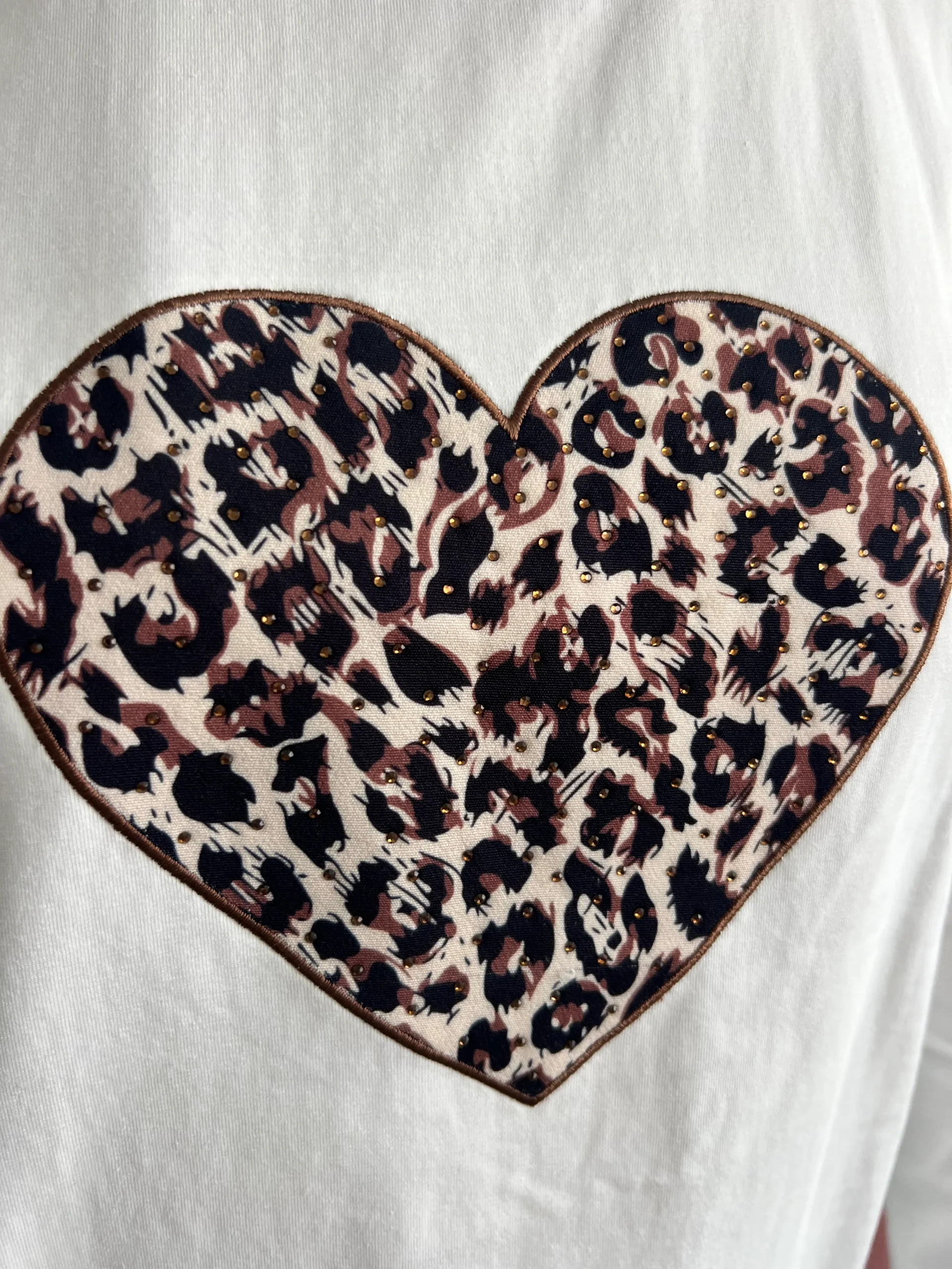 Una camiseta con personalidad, cómoda, suave y con ese toque salvaje que marca la diferencia. Su diseño con manga larga la hace ideal para entretiempo y otoño, y su protagonista indiscutible es el corazón central en tejido de estampado animal print con mini tachuelas brillantes, que le da un aire rompedor, moderno y lleno de actitud 💥.