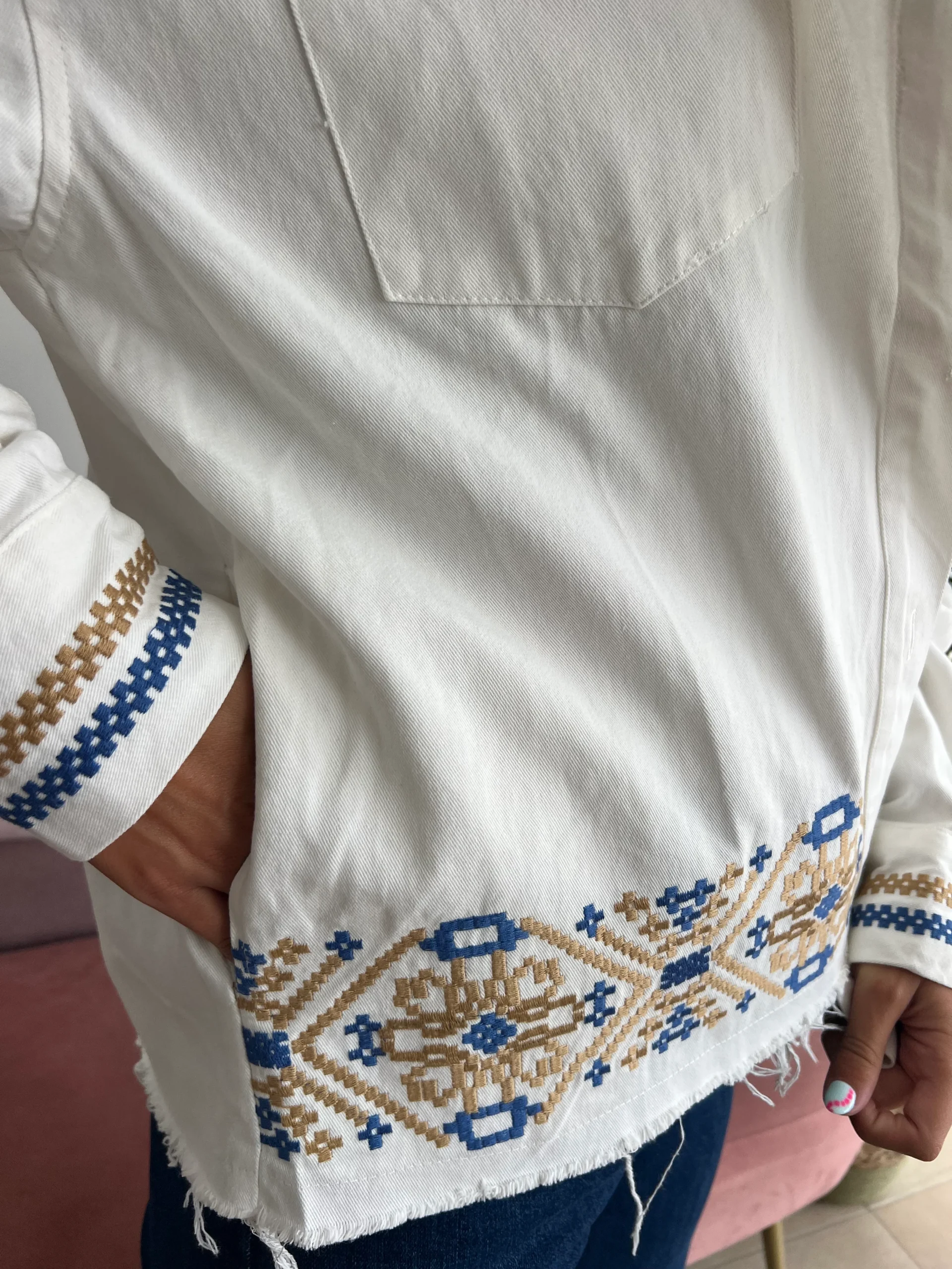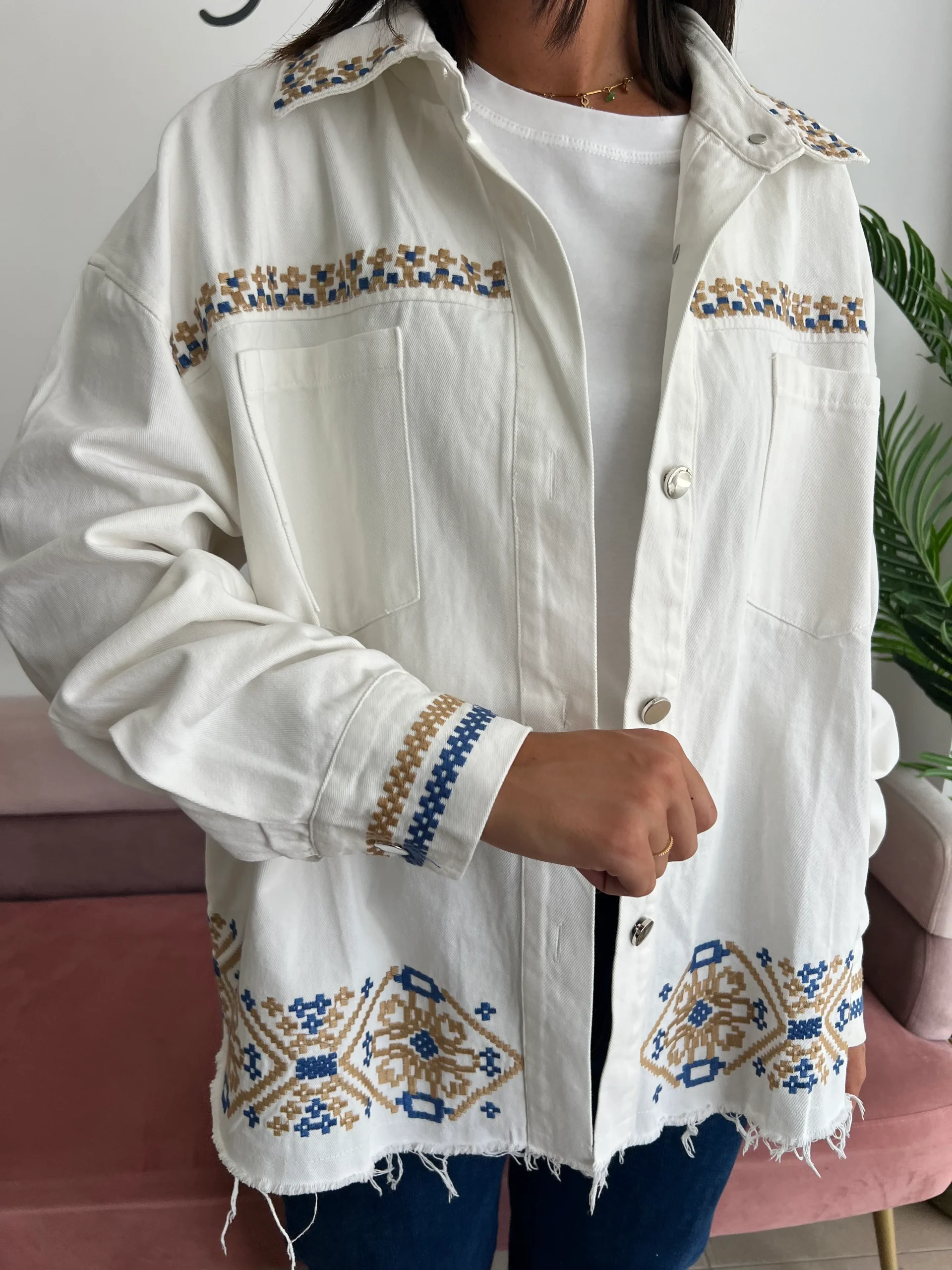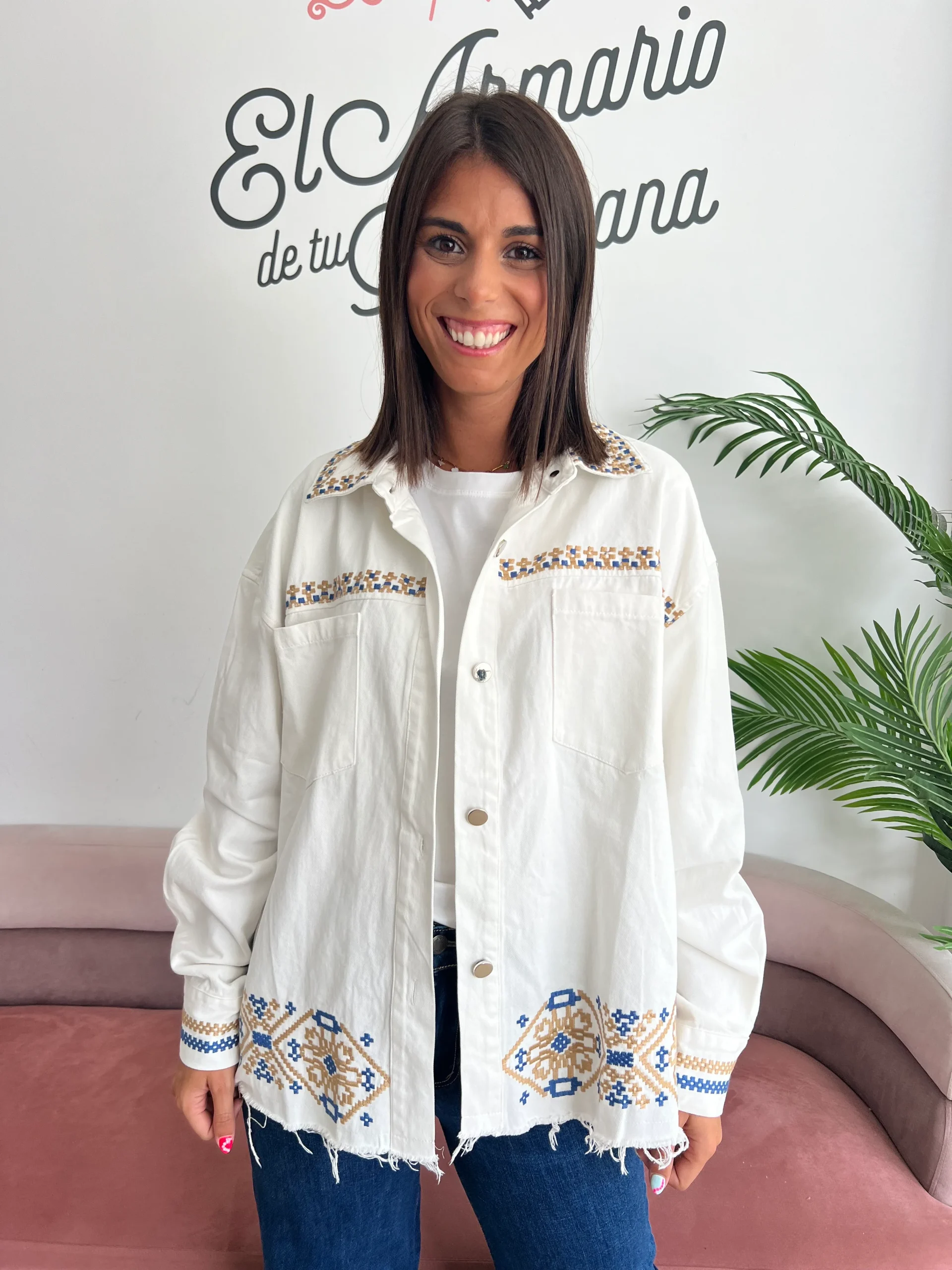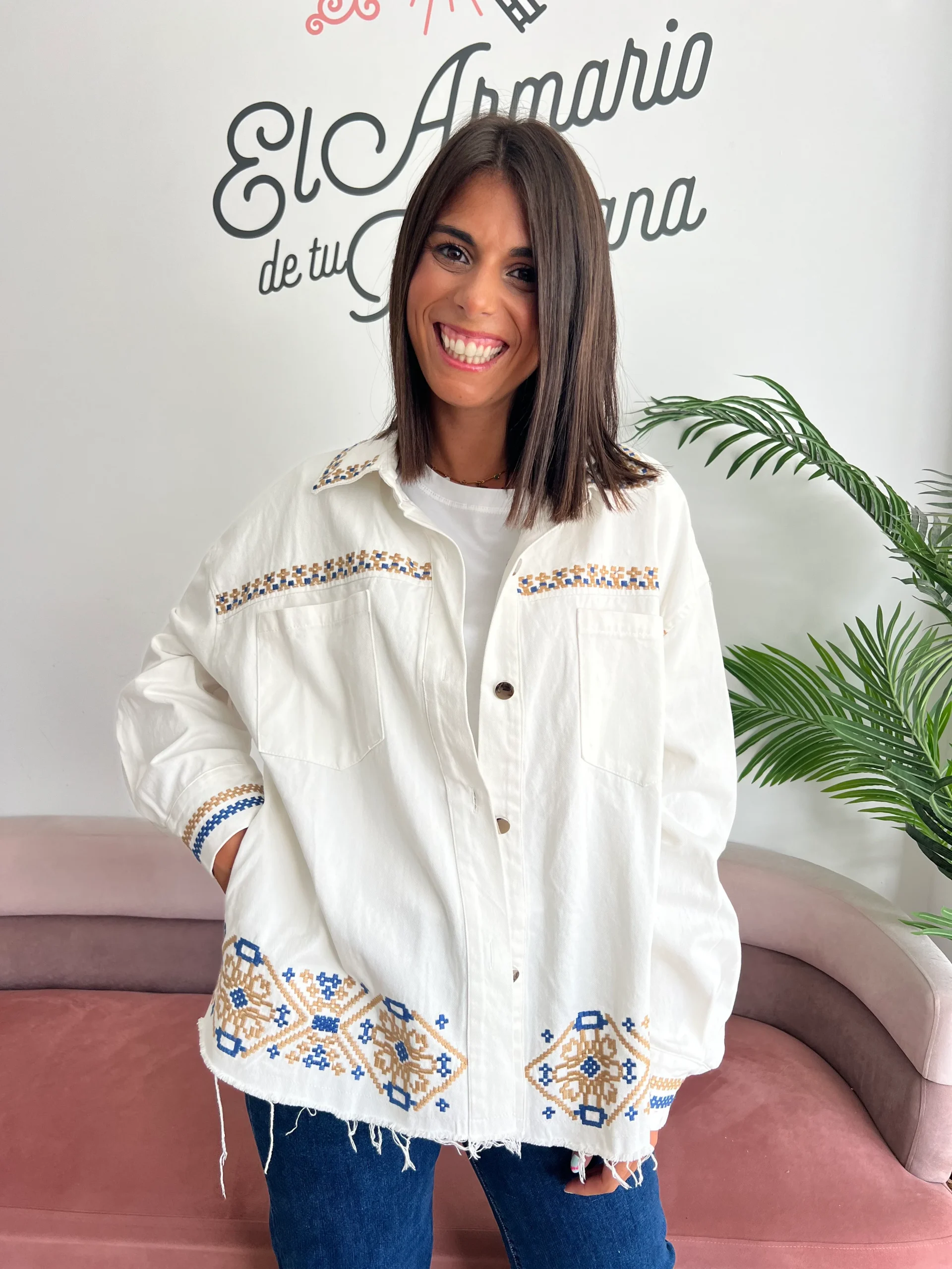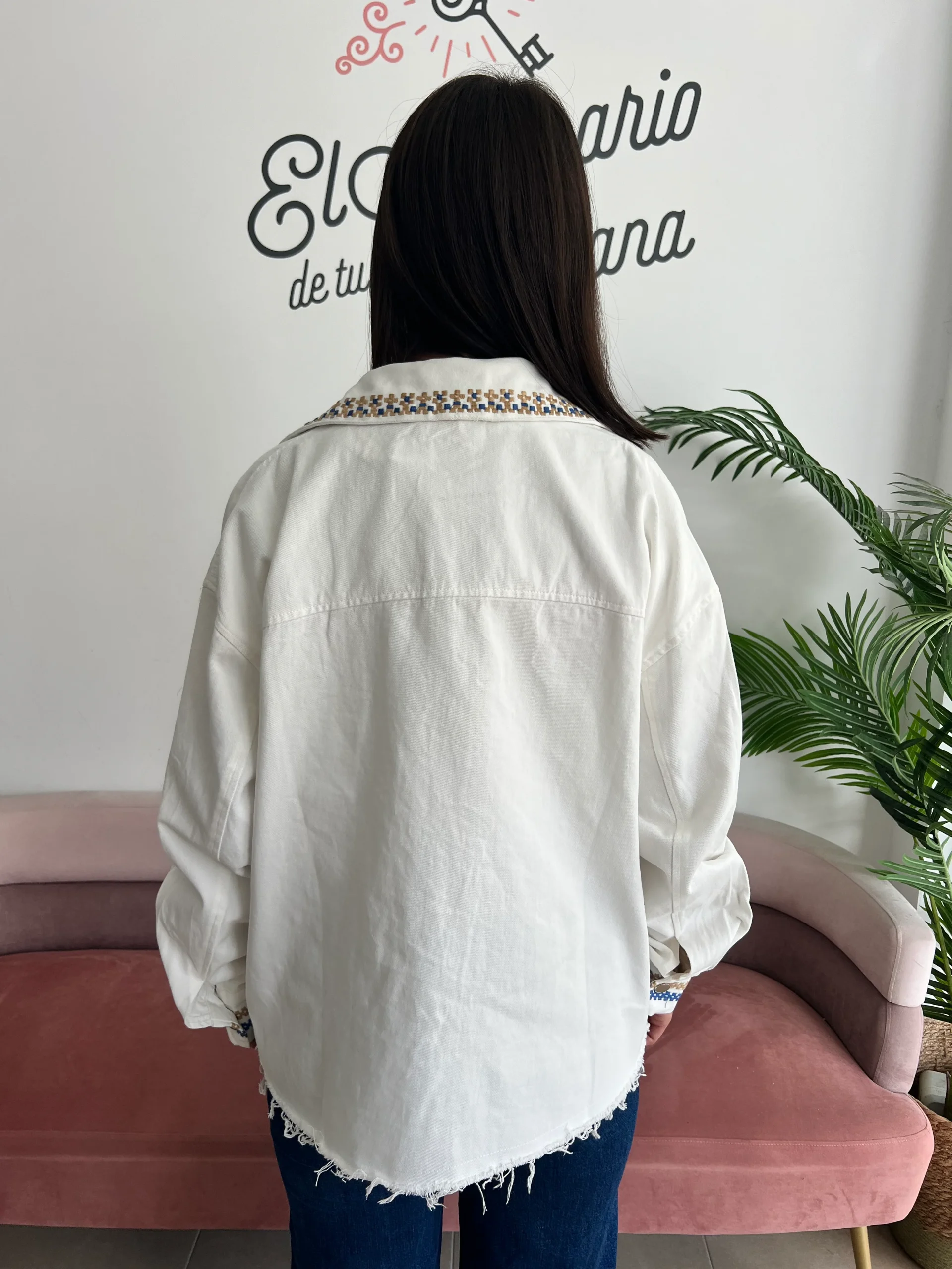 Esta chaqueta vaquera blanca con bordados 💫 es una prenda que no pasa desapercibida. Su diseño combina el estilo atemporal del denim con detalles bordados 💙 que le dan un aire boho y diferente. Los acabados desflecados en el bajo le aportan ese toque desenfadado y actual, mientras que el corte oversize hace que sea súper cómoda y estilosa a la vez.