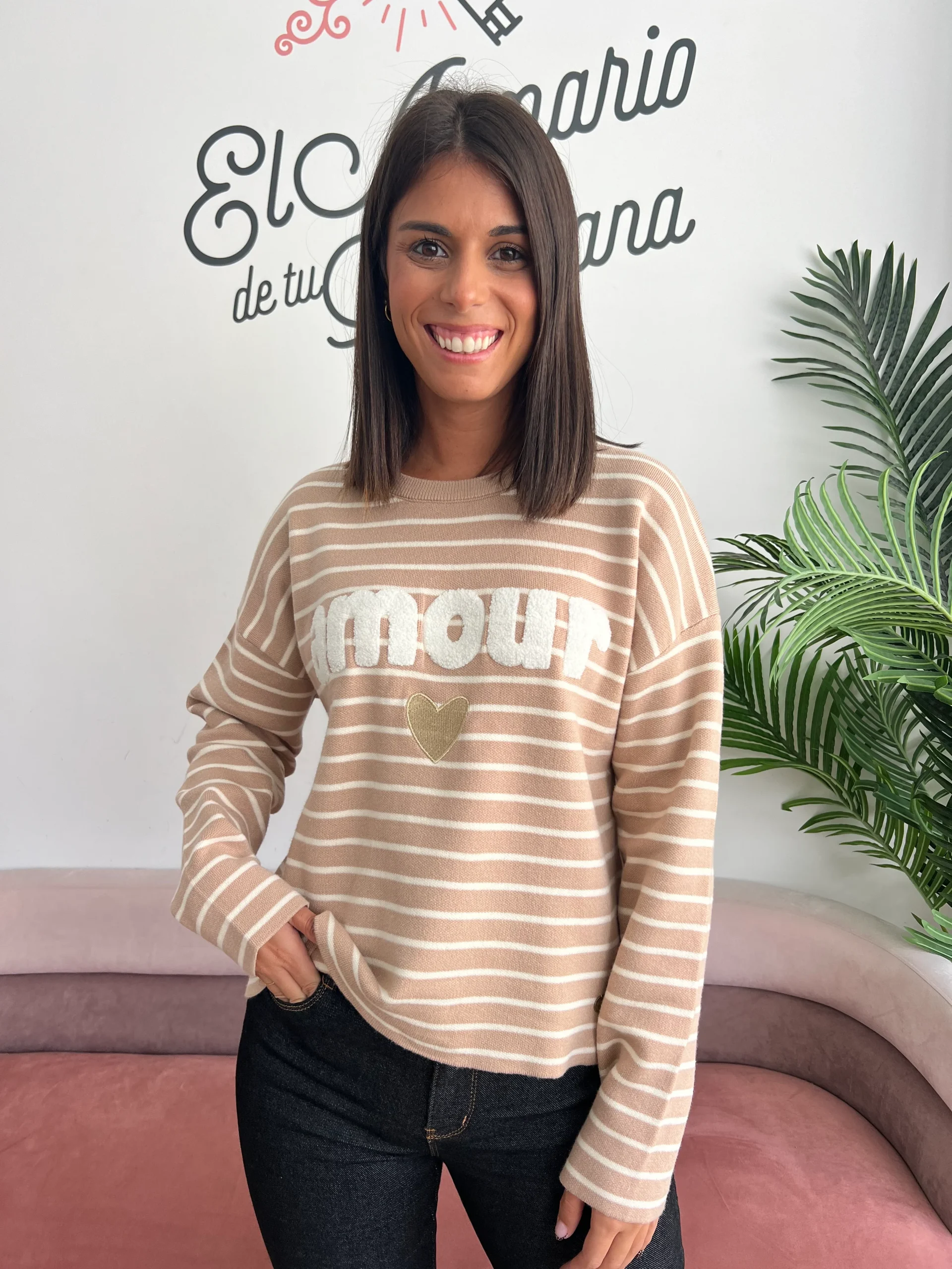 Este jersey no puede ser más ideal 😍. El clásico estampado marinero a rayas en blanco y negro se une con el detalle bordado en relieve “Amour” y un corazón dorado 💛 que lo hace único, coqueto y lleno de estilo.