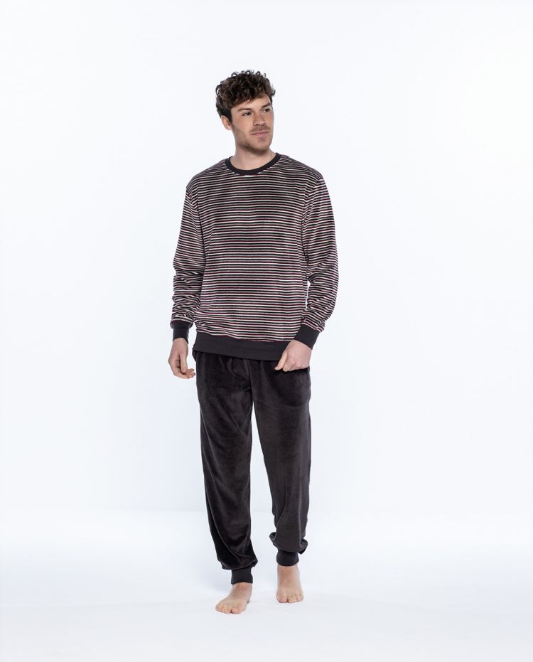 Pijama de hombre de terciopelo en algodón. Camiseta de rayas de colores, cuello redondo y manga larga con puños. Pantalón largo liso con puños y bolsillos. Tejido muy suave y agradable.