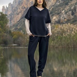 Pijama de invierno para mujer, de tejido en terciopelo polar, camiseta rosa con dibujo oso panda sobre luna.