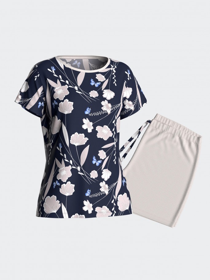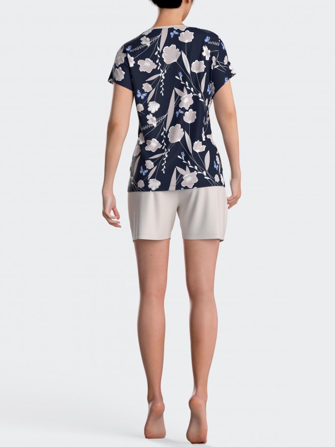 Con camiseta de estampado floral sobre fondo azul oscuro, de manga corta y cuello redondo y pantalón corto liso.