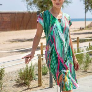 Vestido de verano de punto estampado, con cuello pico, manga caída y anilla decorativa en escote.